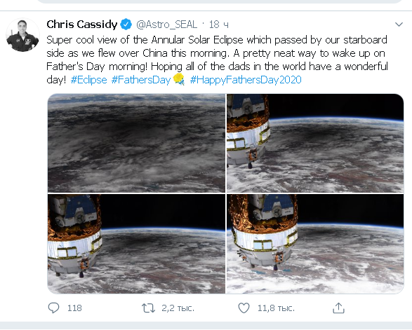 Chris Cassidy✔@Astro_SEAL Super cool view of the Annular Solar Eclipse which passed by our starboard side as we flew over China this morning. A pretty neat way to wake up on Father’s Day morning! Hoping all of the dads in the world have a wonderful day! #Eclipse #FathersDay #HappyFathersDay2020Twitter Американский астронавт Кристофер Кэссиди сфотографировал с […]