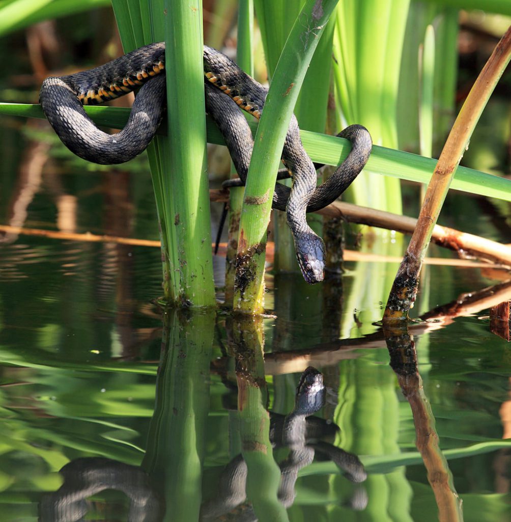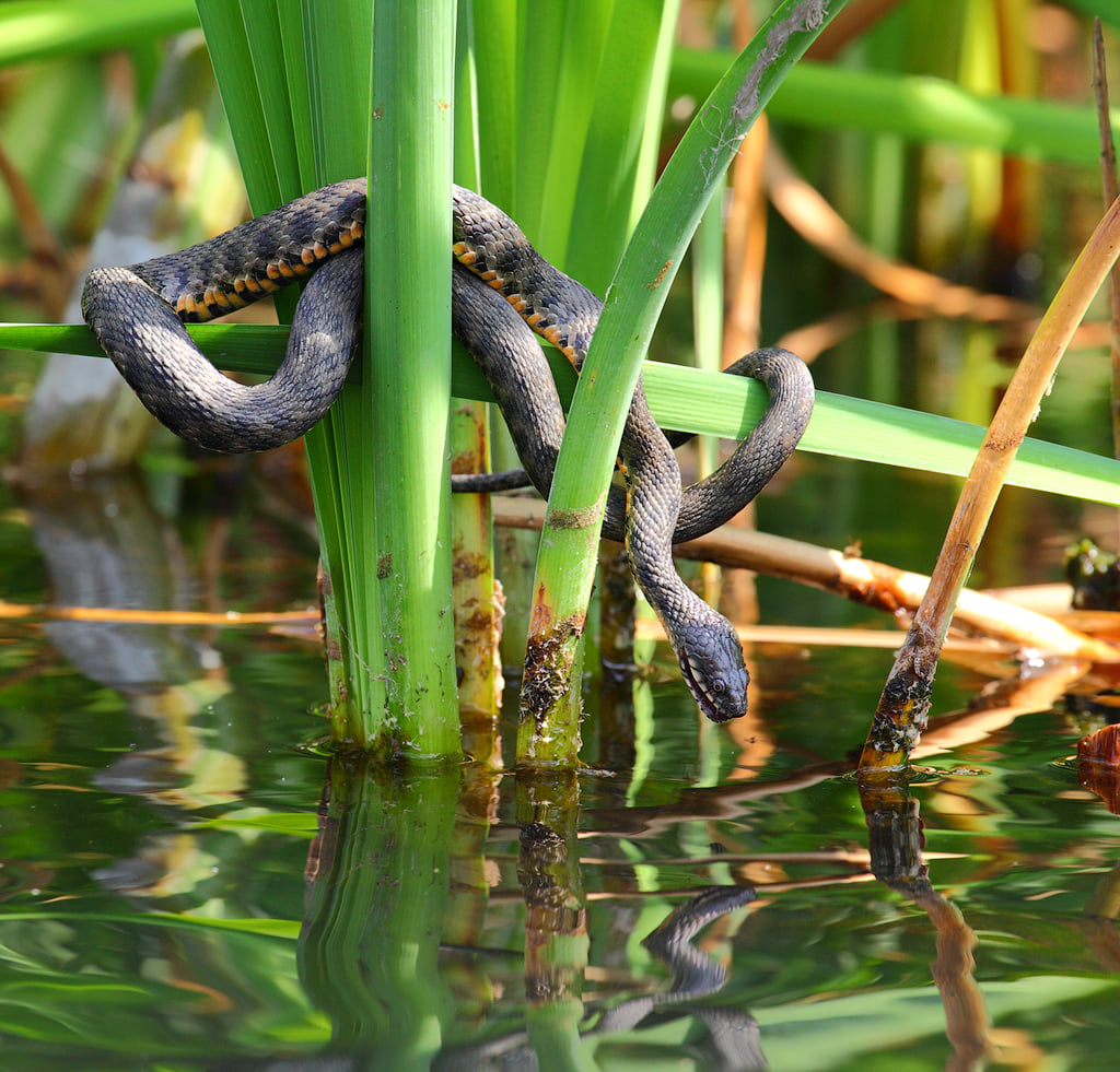 как водяной уж (лат. Natrix natrix) охотится на рыбу.