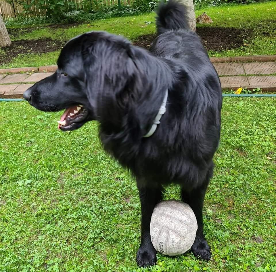Котик растягивается во всю длину на подстилке пса. Гигант грустно лежит рядом на полу.