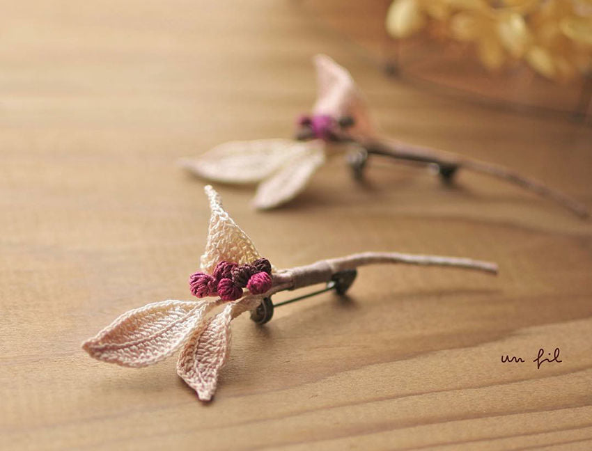 один из мотивов в творчестве Un Fil — простые и элегантные зеленые веточки, где связанные элементы крепятся на тончайшую проволоку.