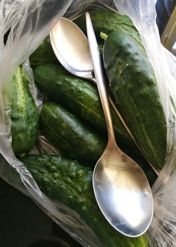 чтобы свежие огурцы долго хранились, надо в пакет с ними положить две обычные столовые ложки из нержавейки.