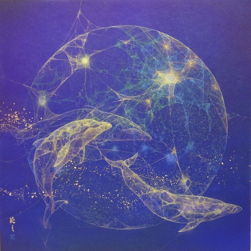 Исходя из убеждения, что одна нить соединяет все живое, Нориюки Кобаяши формирует предмет из тонких золотых линий, которые пересекаются, создавая тканый узор, полный жизни.
