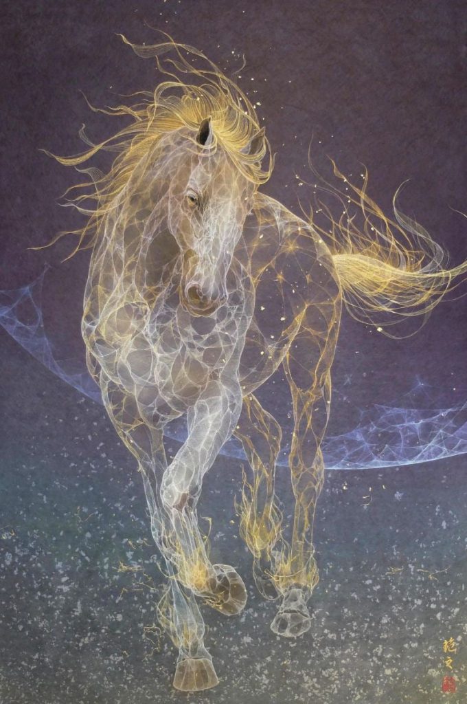 Он использует невероятно тонкие мазки золотой и серебряной краски, напоминающие нити, для изображения животных, птиц и цветов на ярком фоне.