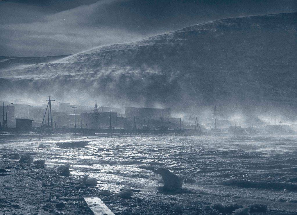 Редчайшая фотография, на которой запечатлен южак – самый сильный в мире постоянный ветер, часто дующий в Певеке. Фотография Сергея Бегунова, геолога Чаунской ГРЭ, даже в National Geographic нет фотографии лучше. Потому что когда он дует, невозможно даже устоять на ногах, не то что сделать кадр – люди часто передвигаются ползком…