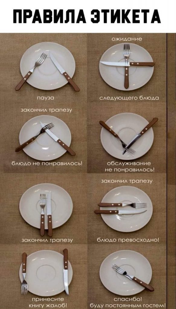 Нет, ну ясен пень, мы во время паузы кладём ту часть приборов, которой едим, на тарелку, а не на скатерть. Но, как именно кладём – вопрос только личных предпочтений. А вот этот плакатик можно распечатать и сжечь [вместе с тем, кто придумал эту херню].
