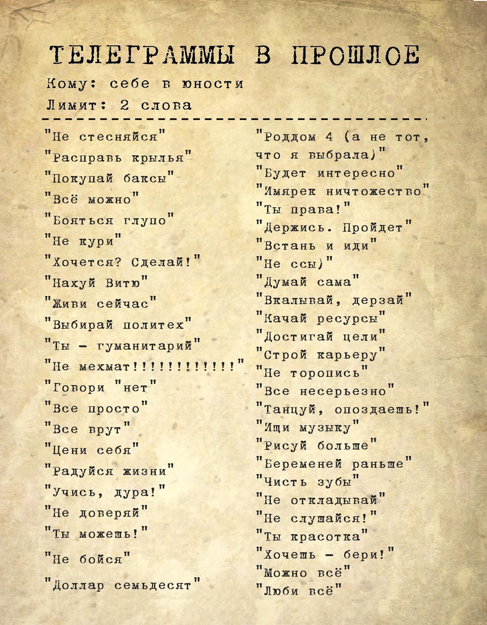 “Если бы ты мог написать молодому себе, что бы ты написал, будь у тебя всего два слова?”