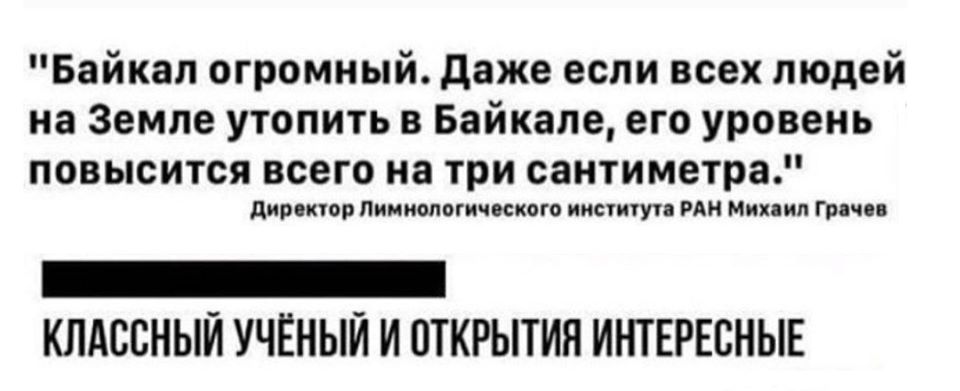 Вы спрашивали о роли наглядности в образовательном процессе. Валентина Габышева PS:Lyudmila Soldatova Если уровень Байкала повысится на 3 см, в нем прибавится 951 млн м3, то есть затолкнуть надо 15,8 млрд человек (из расчёта средней массы 60 кг, тк заталкиваем всех подряд, детей, взрослых, всех). А население всей планеты 7,5 млрд ?♀️ так что уровень повысится см на […]