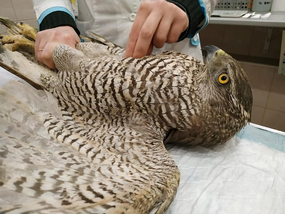 Ястреб тетеревятник, самец. Две дробины в теле.. Перелом плечевой кости рядом с суставом, перелом Лопатки, респираторная инфекция.